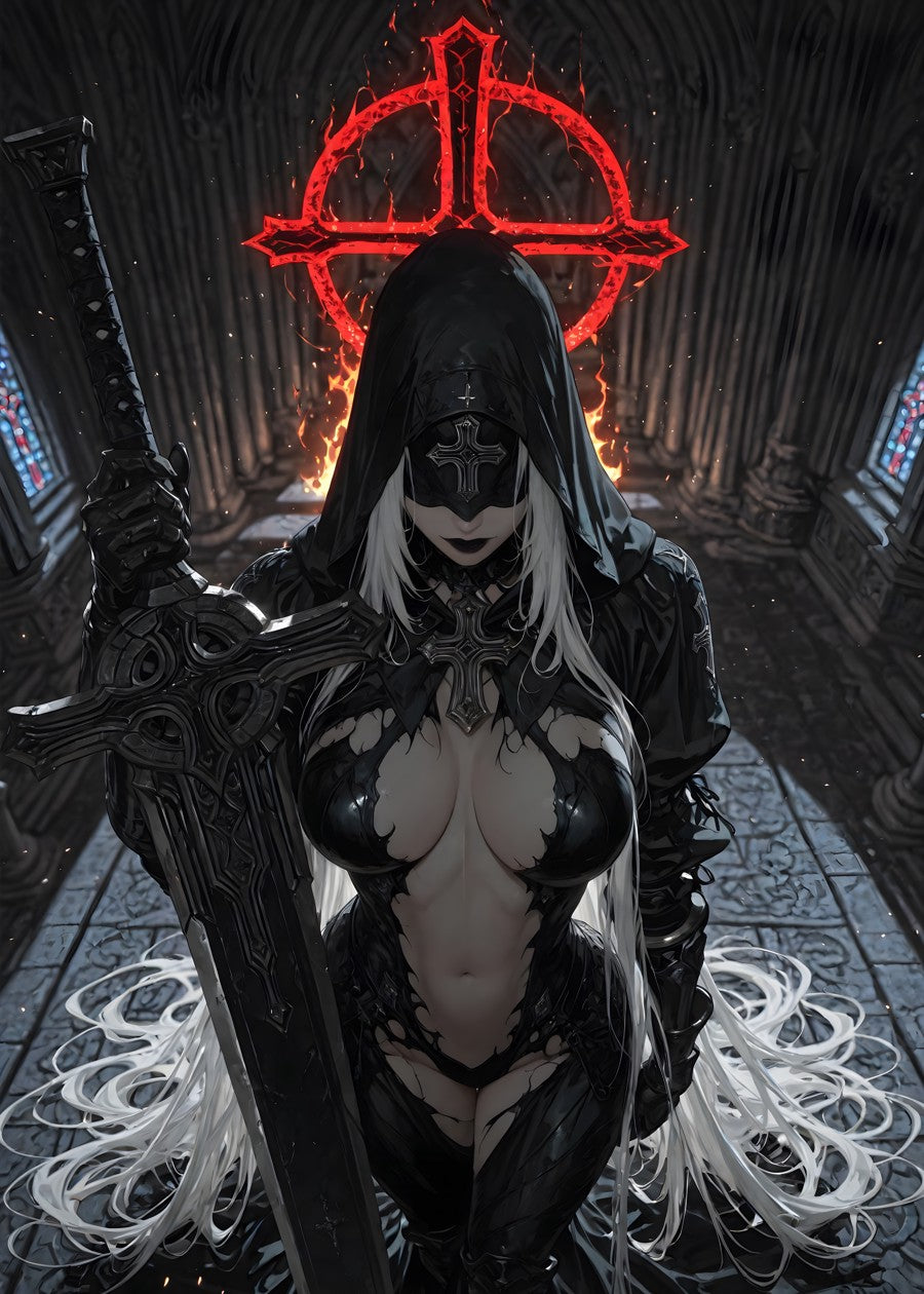 A mysterious warrior clad in dark armor, standing resolute with a blazing symbol behind.