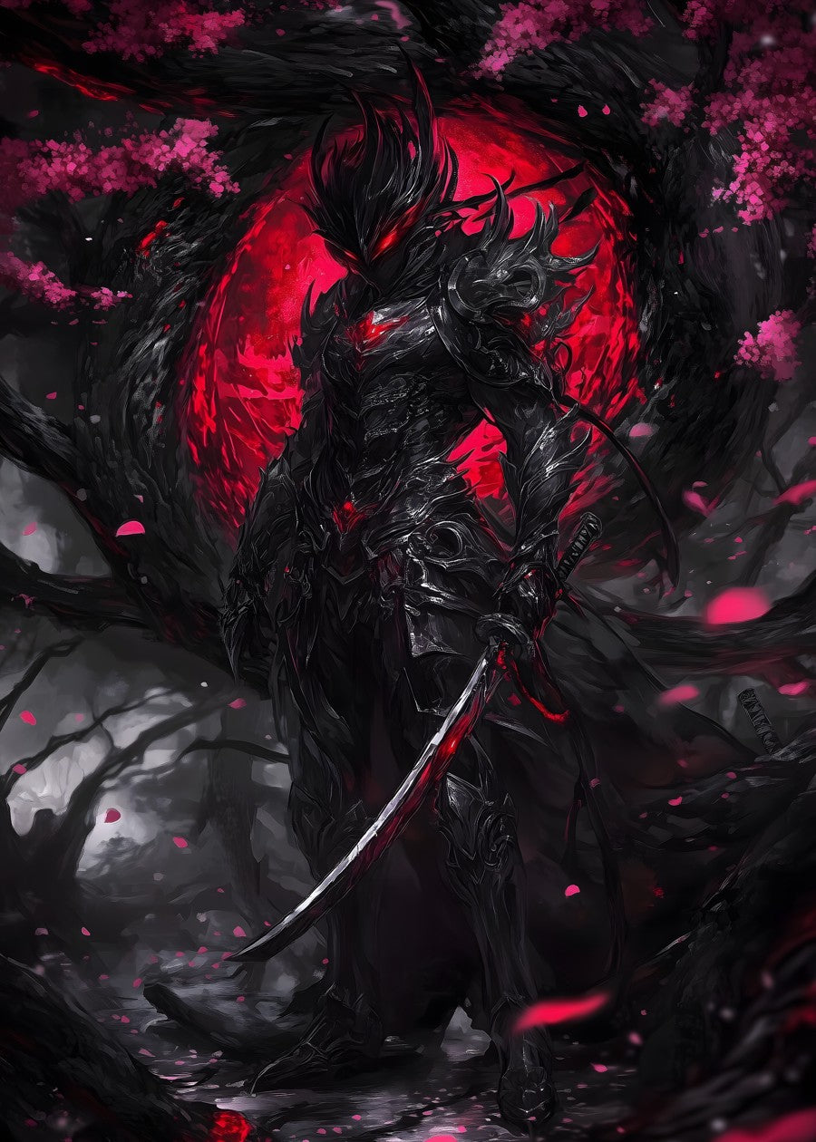 A shadowy warrior stands beneath cherry blossoms, wielding a blood-red blade.