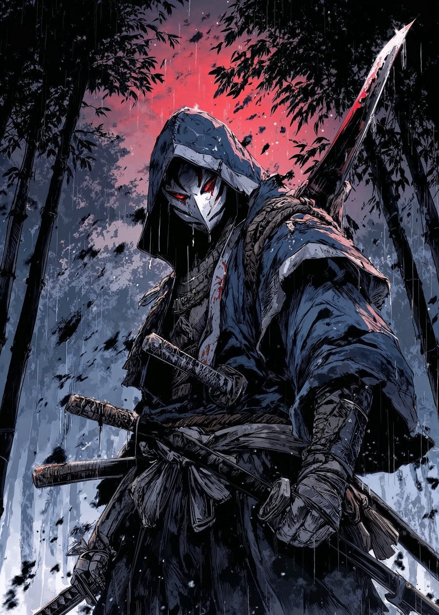 A hooded samurai in a haunting mask stands in the rain-soaked bamboo forest, blades drawn and bloodied, eyes glowing red.
