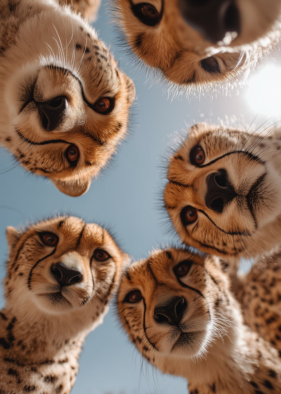 A wild group selfie! These four curious cheetahs crowd the frame, offering an intense and personal look into their bright, striking eyes.