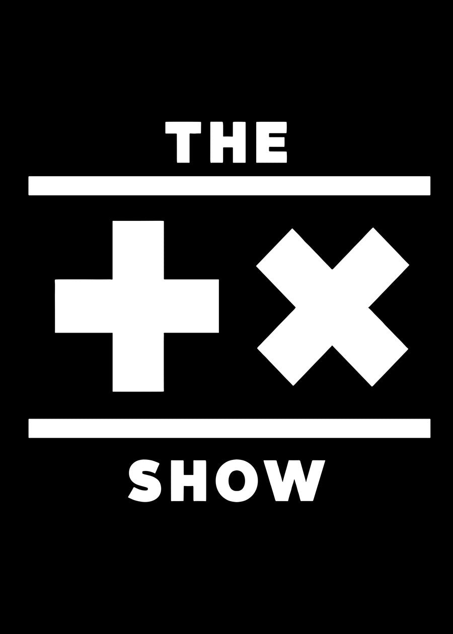 A simple and bold graphic poster for "The Plus X Show," using large white plus and X symbols on a black background, separated by horizontal
