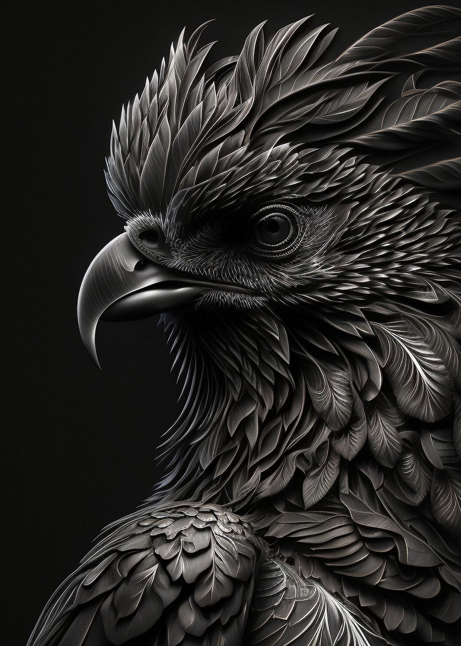 A highly detailed, monochrome close-up of an eagle's head. The feathers are intricately sculpted.