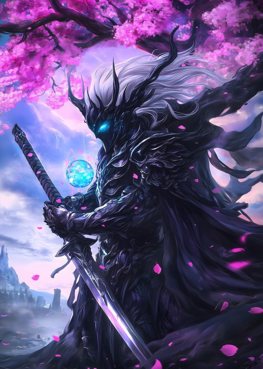 A dark samurai guards under cherry blossoms, sword drawn, magic sphere glowing.