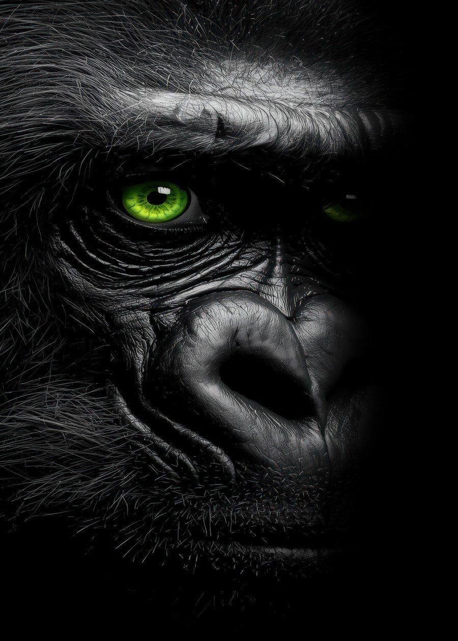 A majestic gorilla exudes quiet authority, its blood-red eyes glowing with untamed wisdom