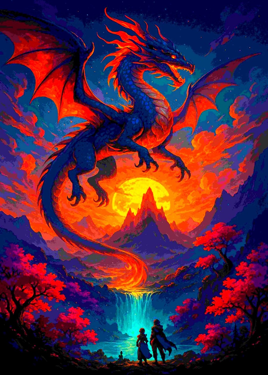 A fiery dragon soars above a glowing volcanic landscape in vivid fantasy detail.
