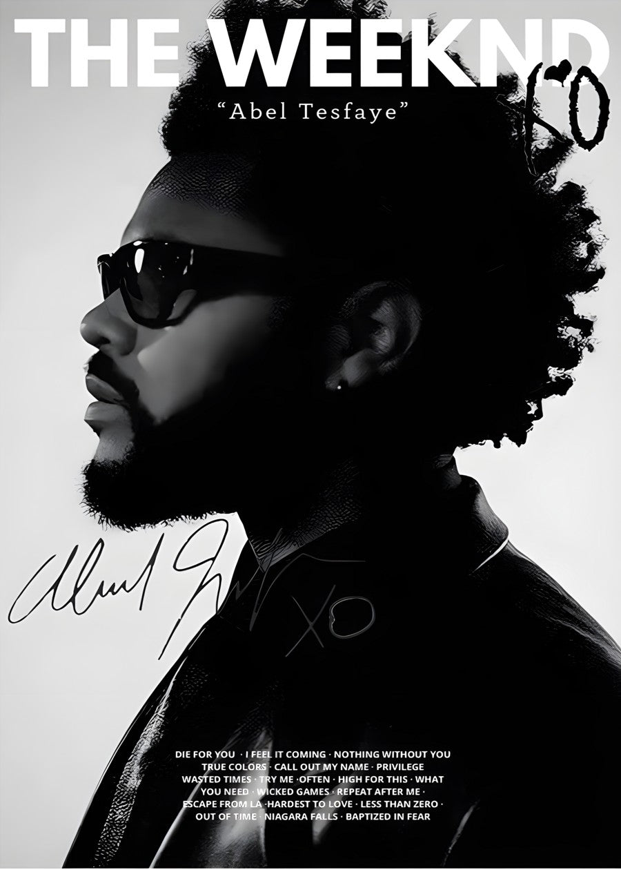 This is a black and white portrait of The Weeknd, also known as Abel Tesfaye. The image appears to be a magazine cover.