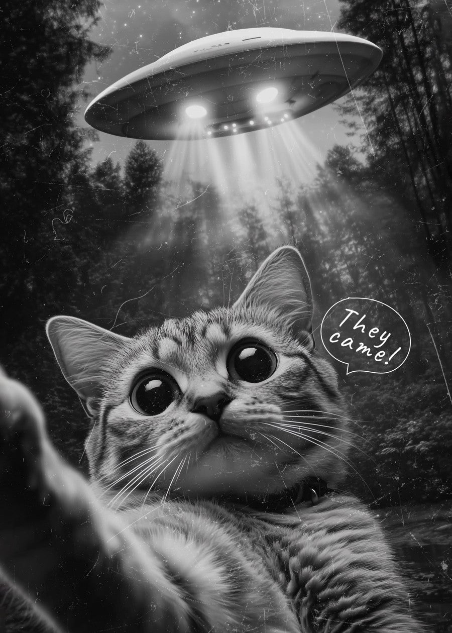 A wide-eyed cat takes a dramatic selfie as a UFO hovers ominously above a forest. A speech bubble reads, "They came!".