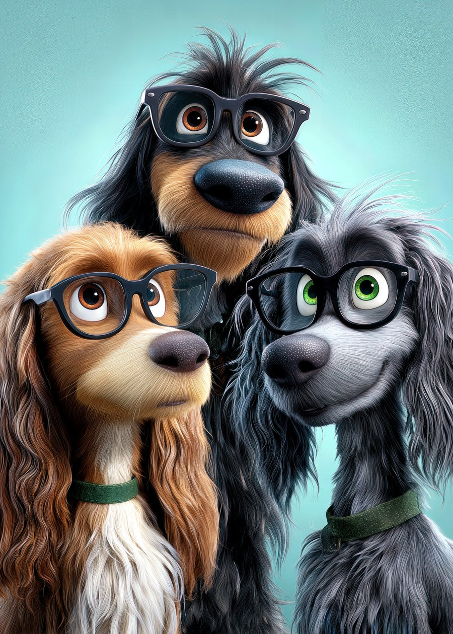 Three Playful Dogs With Glasses Pose for a Fun Portrait Against a Bright Teal Background