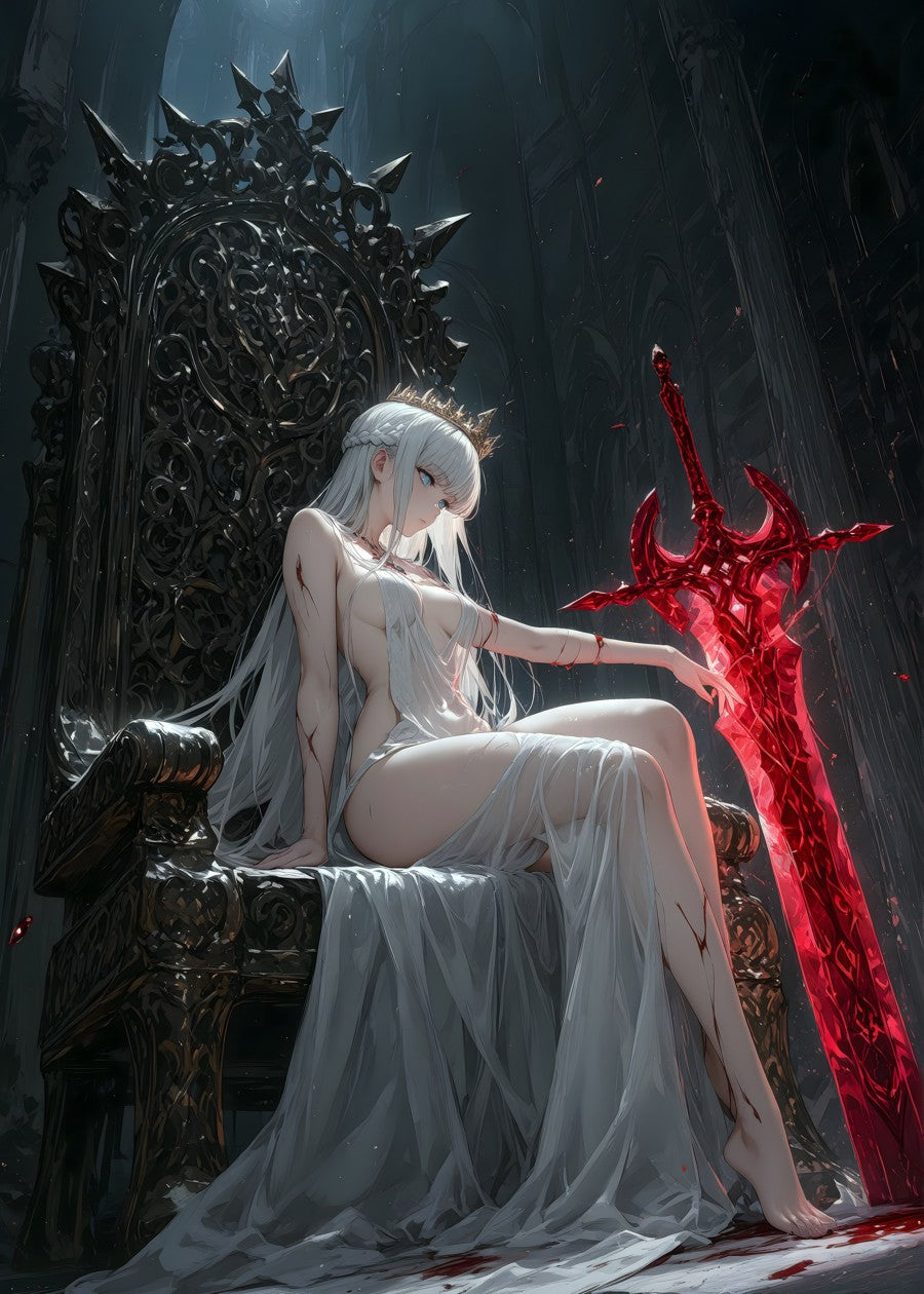 A regal figure on an ornate throne, wielding a vibrant crimson sword.