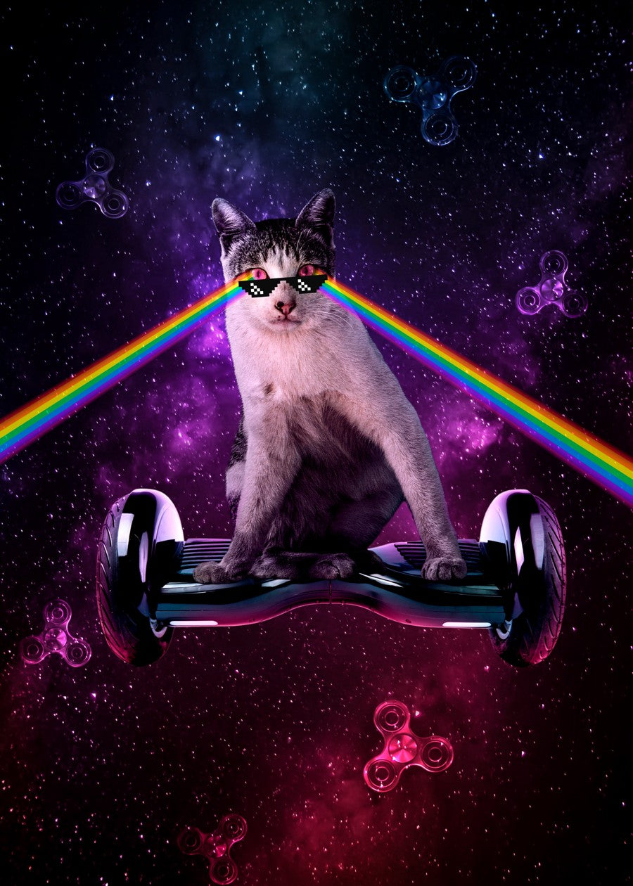 A pixelated thug life cat rides a hoverboard through space. A rainbow light beam adds a trippy, cosmic touch to this cool, meme-worthy image.