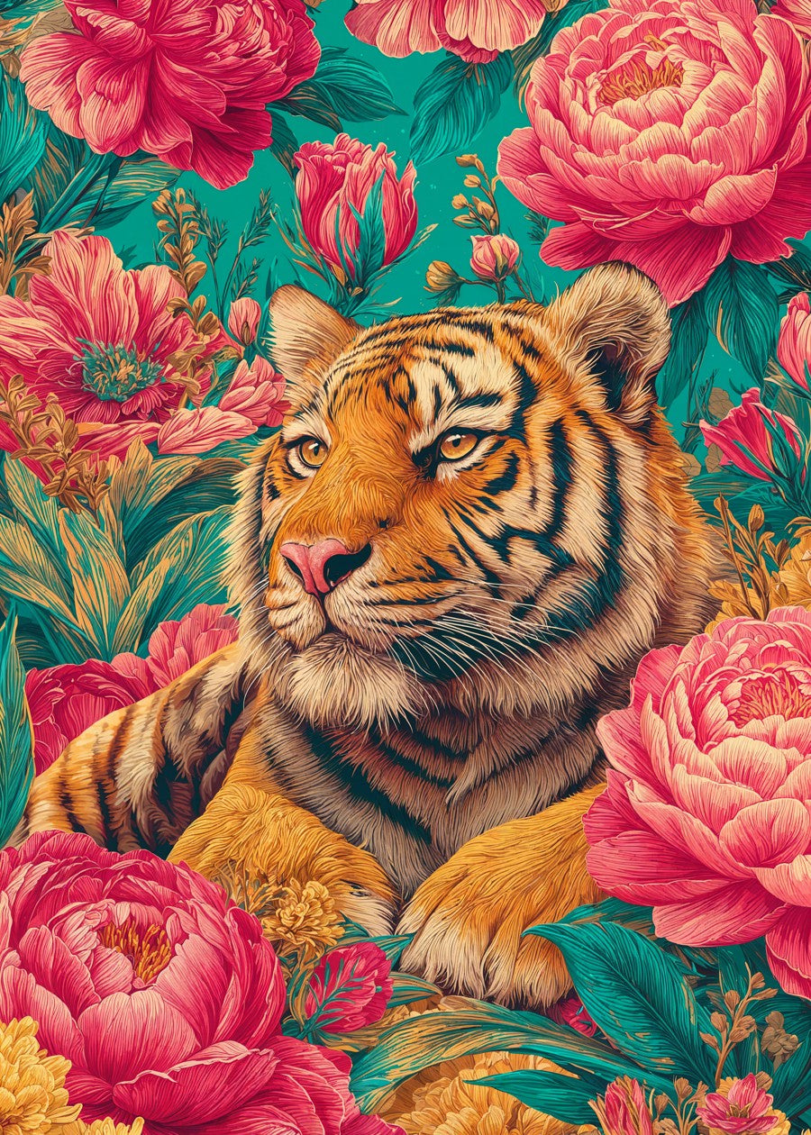A serene tiger rests amidst radiant pink peonies and lush greenery—grace, strength, and floral beauty in perfect harmony.