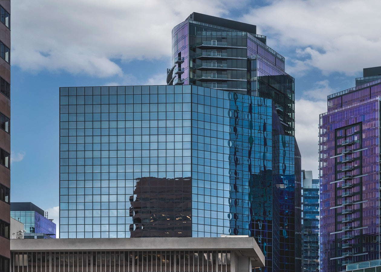 This photograph was taken in Bellevue, Washington. The scene is a symphony of reflections, scattered across windowpanes.