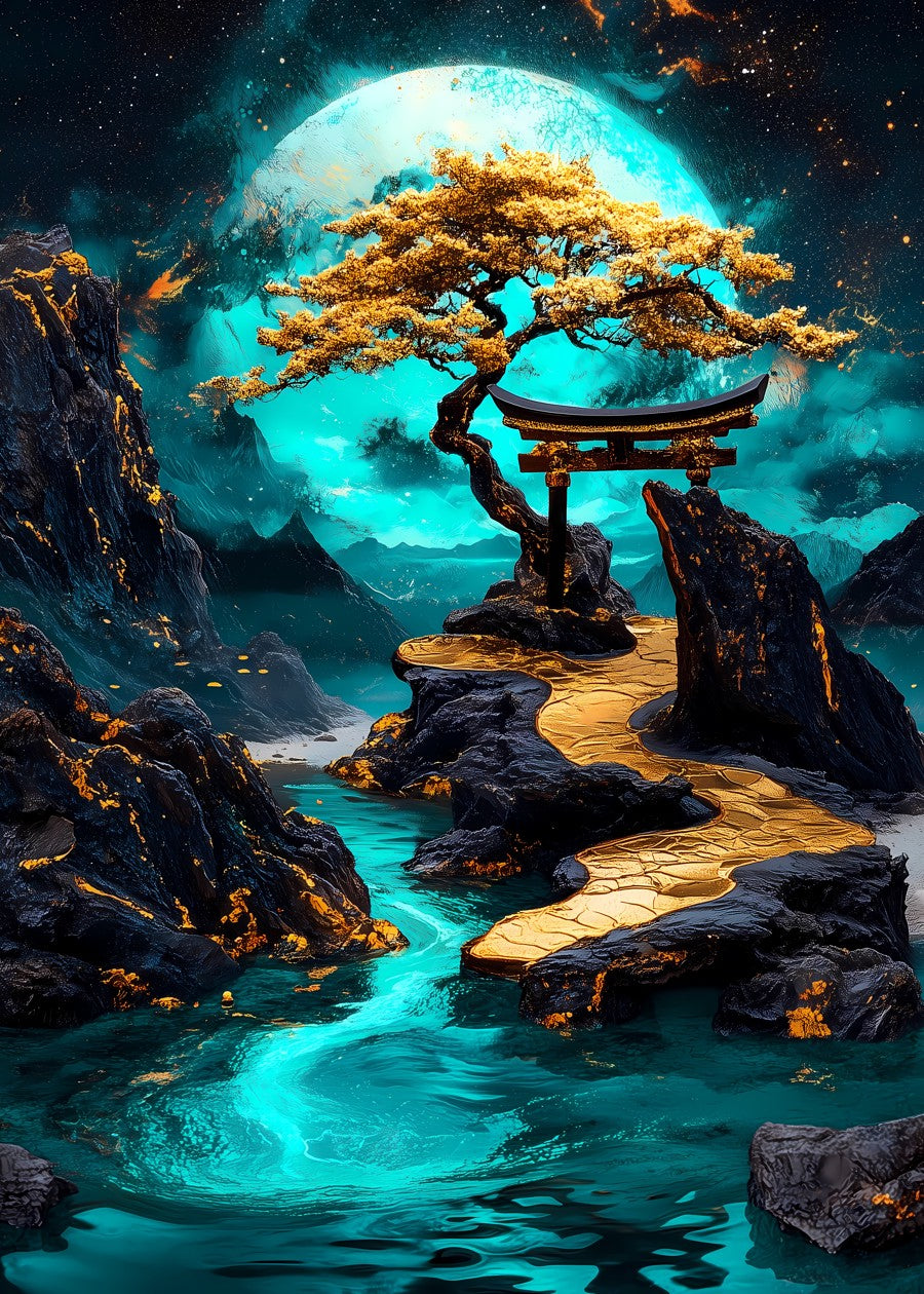 A luminous path leads to a mystical torii under a radiant, ethereal moon.