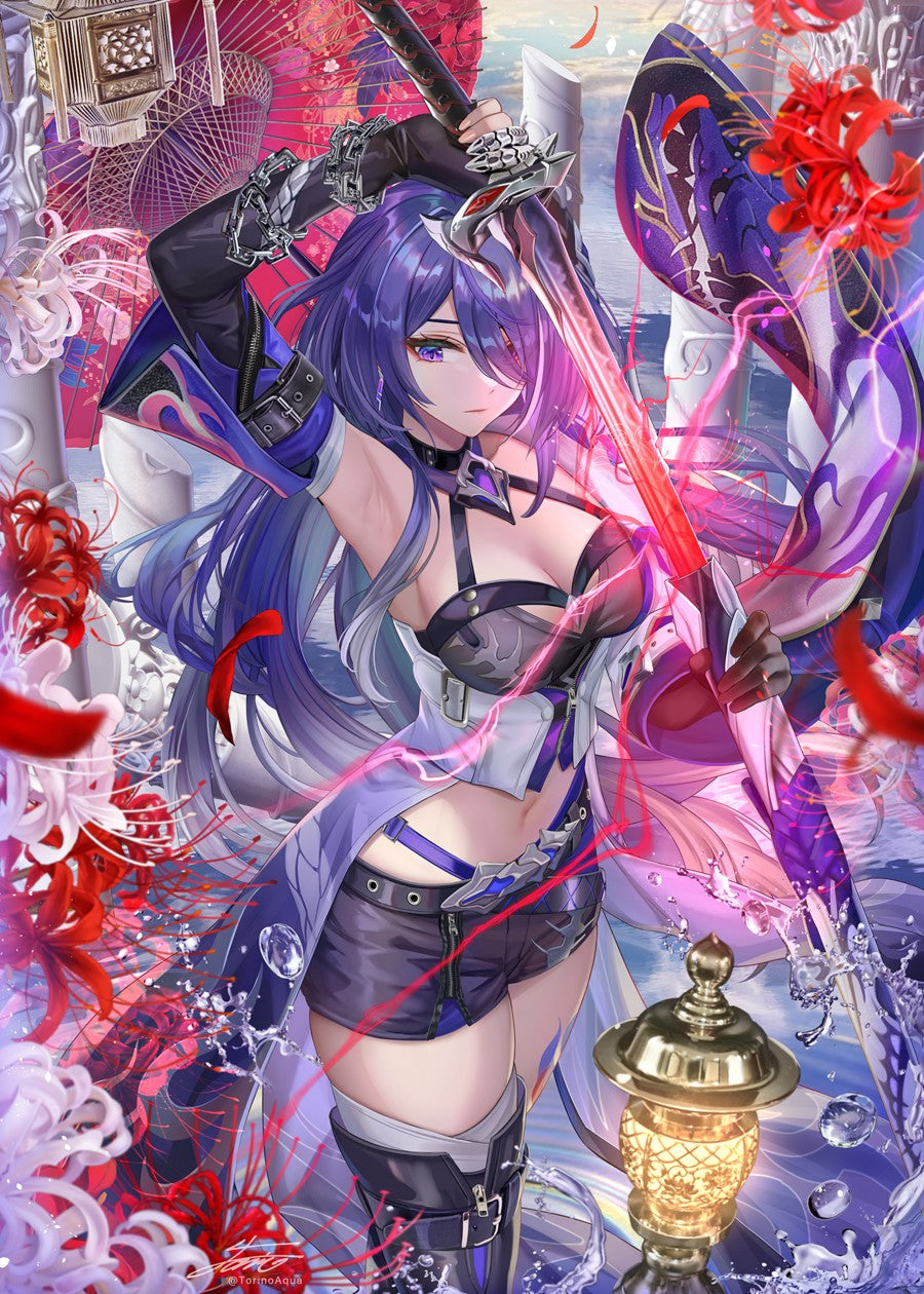Torino Akua, katana, Honkai: Star Rail, Acheron (Honkai: Star Rail), detached sleeves, purple hair, umbrella, anime, anime girls, long hair