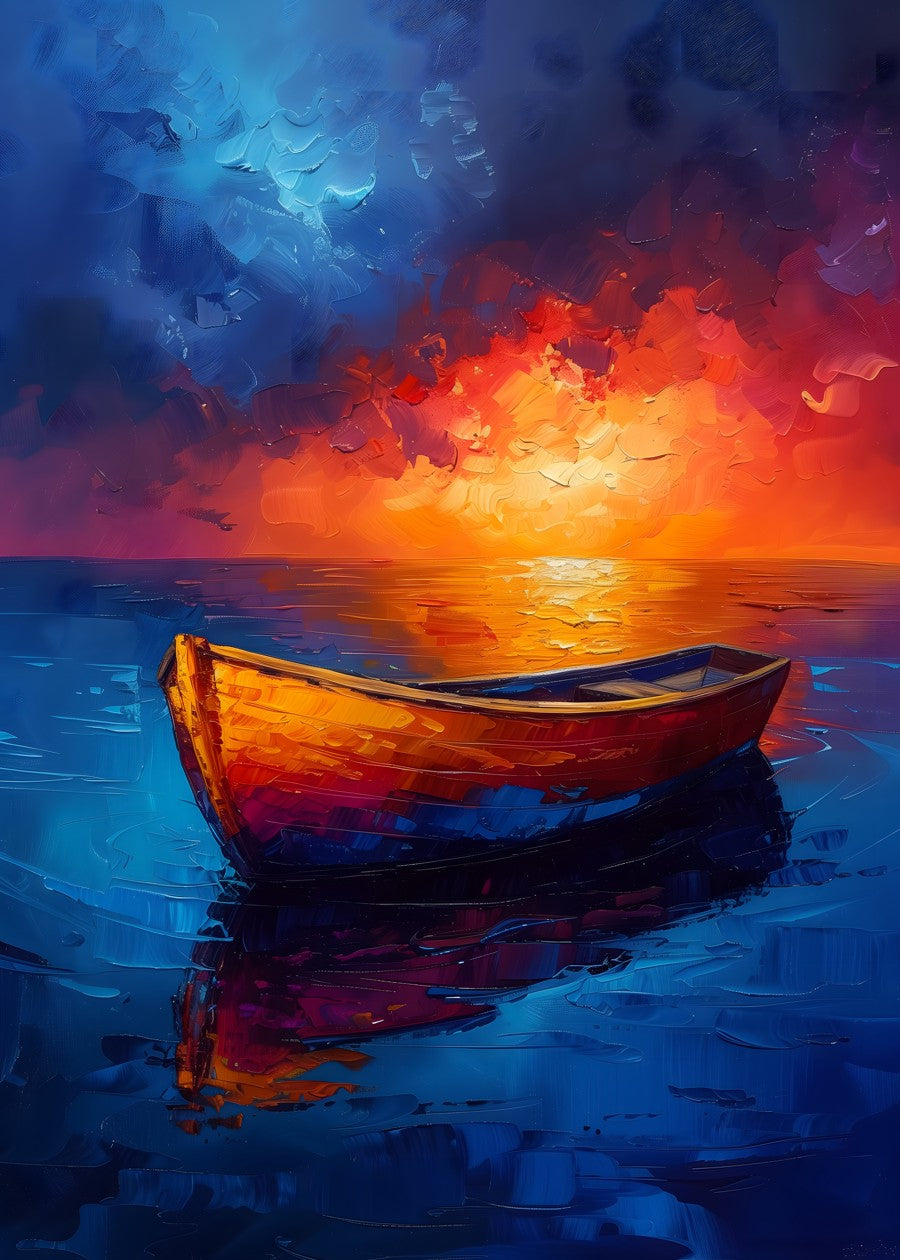 A lone boat drifts under a fiery sunset, reflecting vibrant hues.