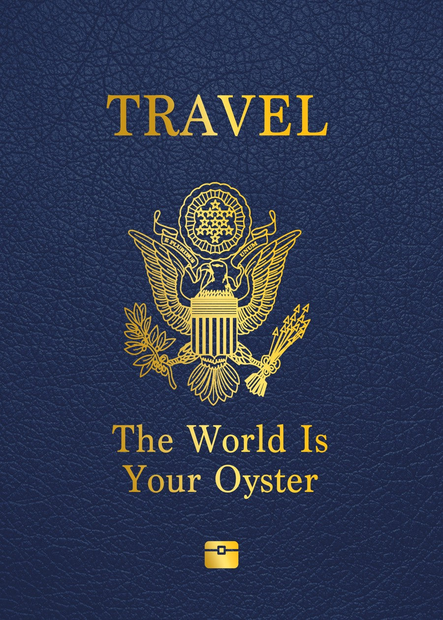 Passport-themed quote art saying 'The world is your oyster' in bold gold letters.