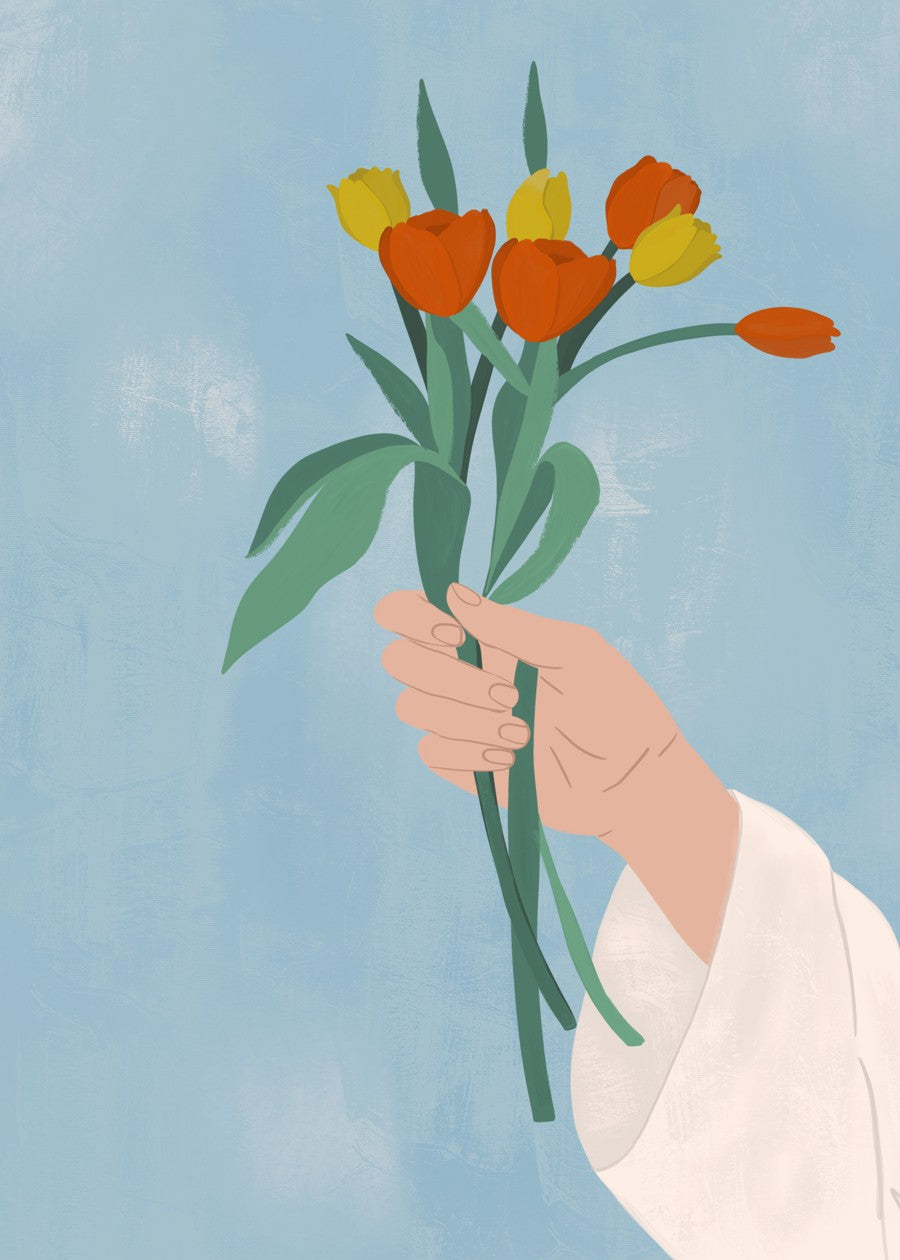 A hand offering red and yellow tulips against a calming blue background, perfect for gentle appreciation.