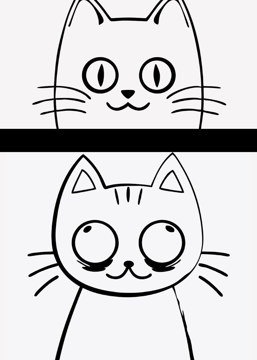 A split image of two simple black and white cat sketches. The top cat looks calm, while the bottom cat has wide, intensely staring, manic eyes.