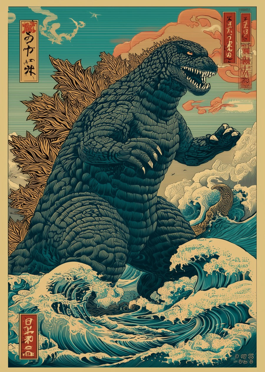 The iconic movie monster, Godzilla, with the traditional Japanese woodblock print style known as Ukiyo-e.