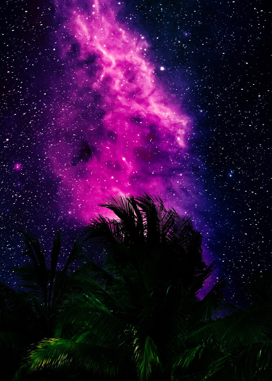 Lush palm trees silhouette against a vibrant, swirling pink and purple nebula, dotted with countless stars in a cosmic night sky.