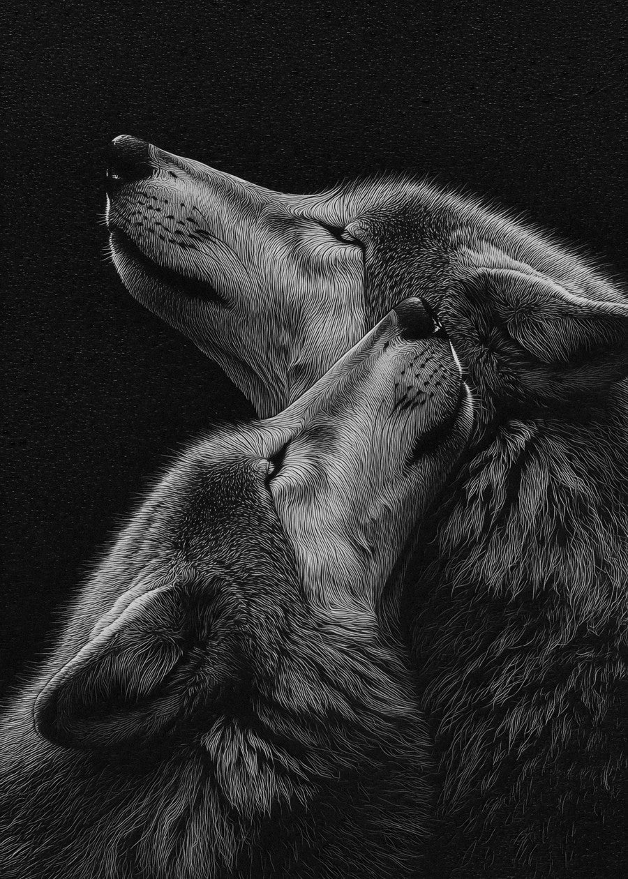 Wolves in intimate harmony, rendered in textured charcoal—bold, moody wall art for wildlife lovers.