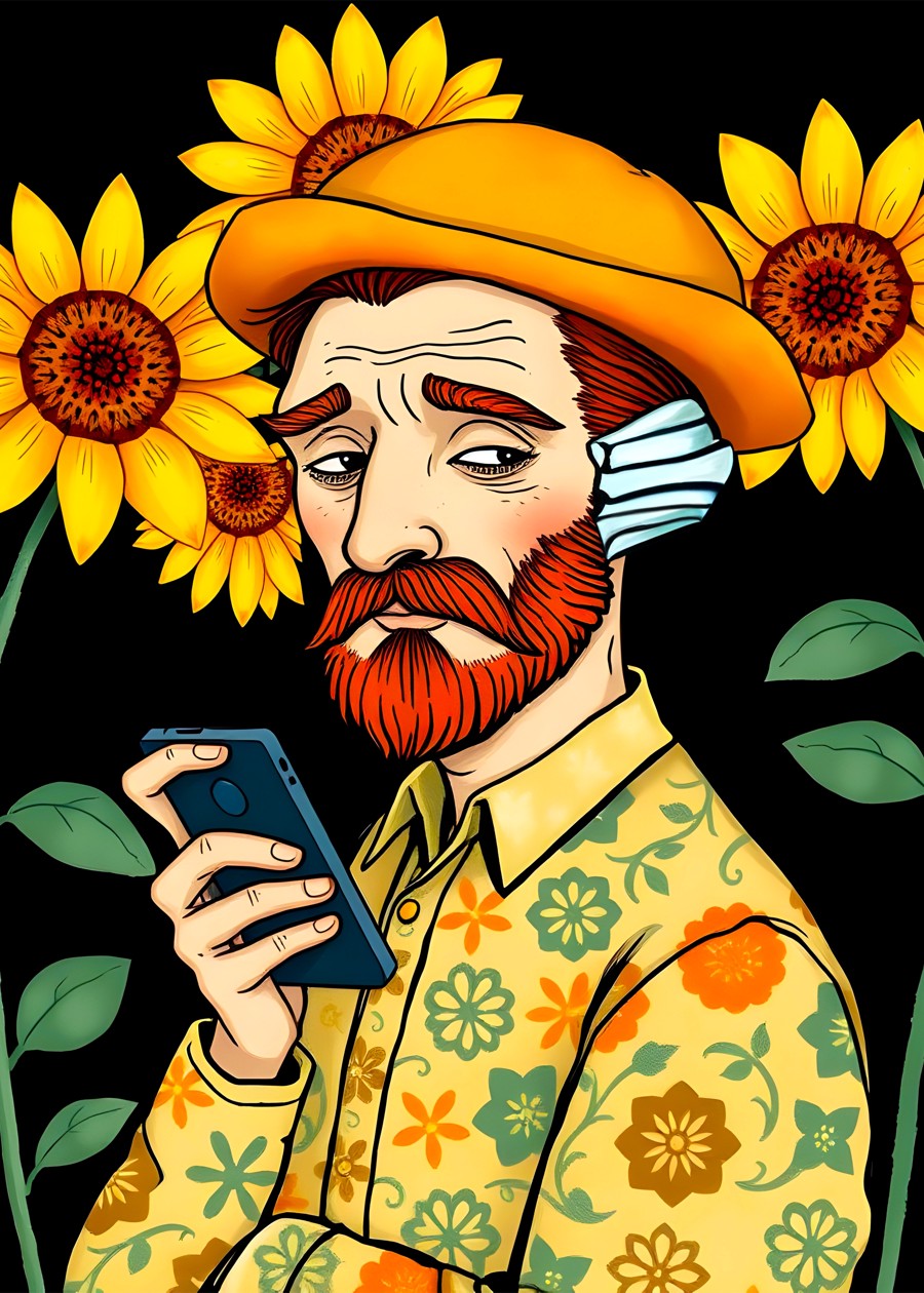 An Illustration of Van Gogh holding a mobile phone with a bandaged ear and sunflowers in background. The portrait is funny and humorous.