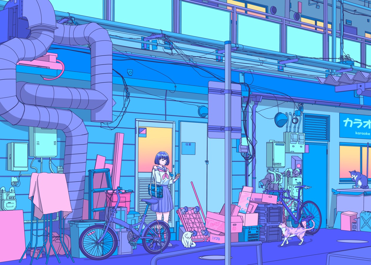 Vaporwave girl and cats in the alley