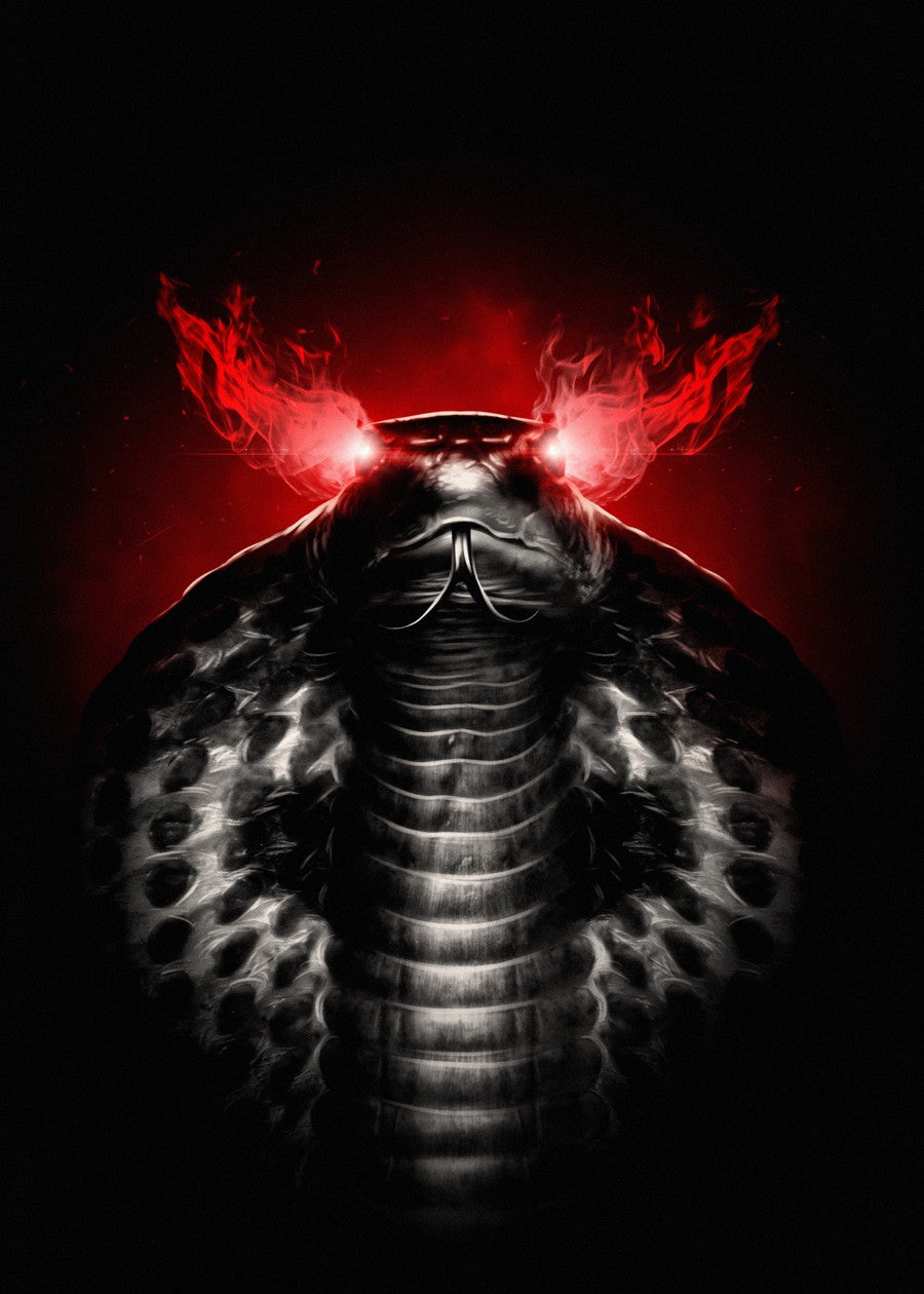 A menacing cobra in black and white with its hood spread, featuring glowing, fiery red eyes. A chilling, dark, and intense portrait.