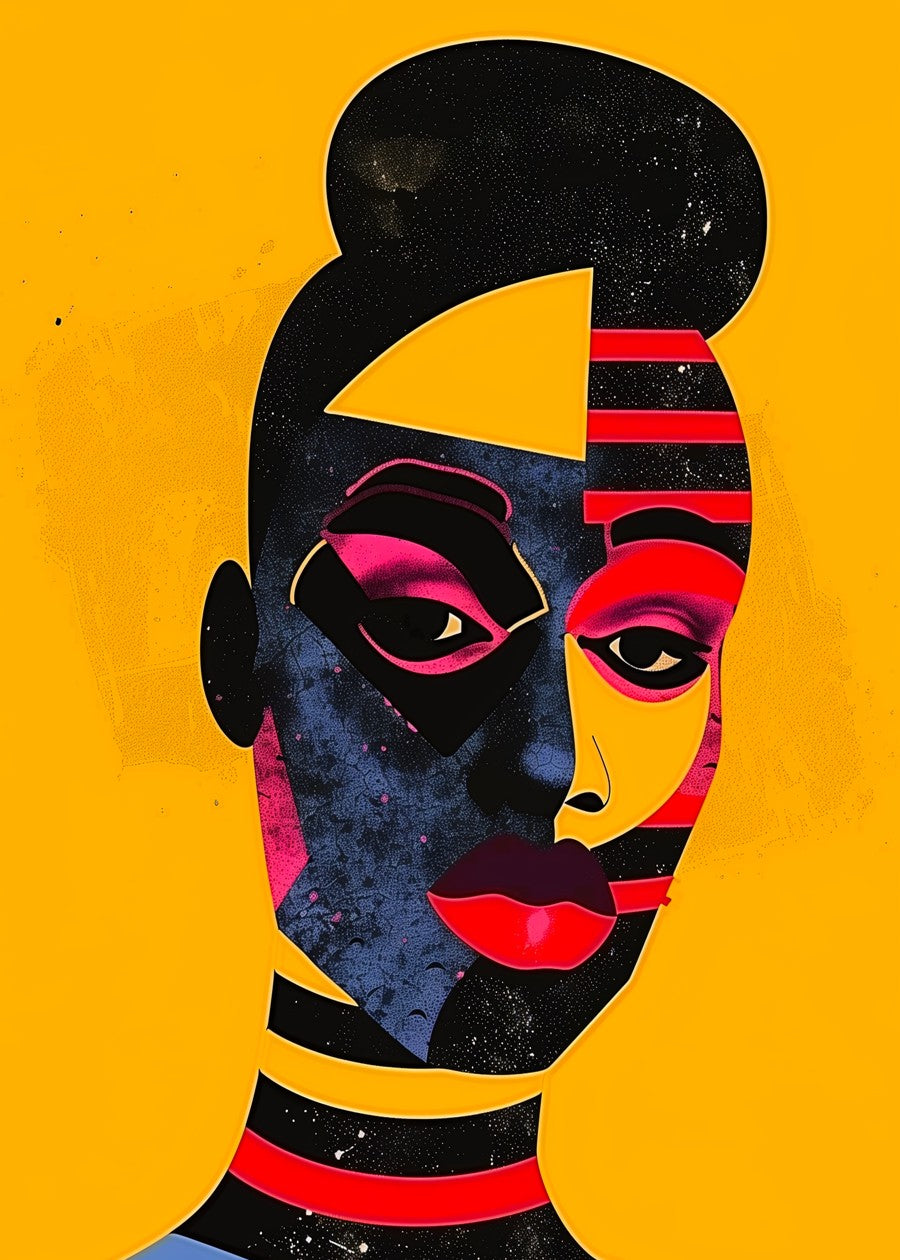 A striking abstract portrait fusing Afro-pop patterns, bold colors, and geometric flair for a modern cultural vibe.
