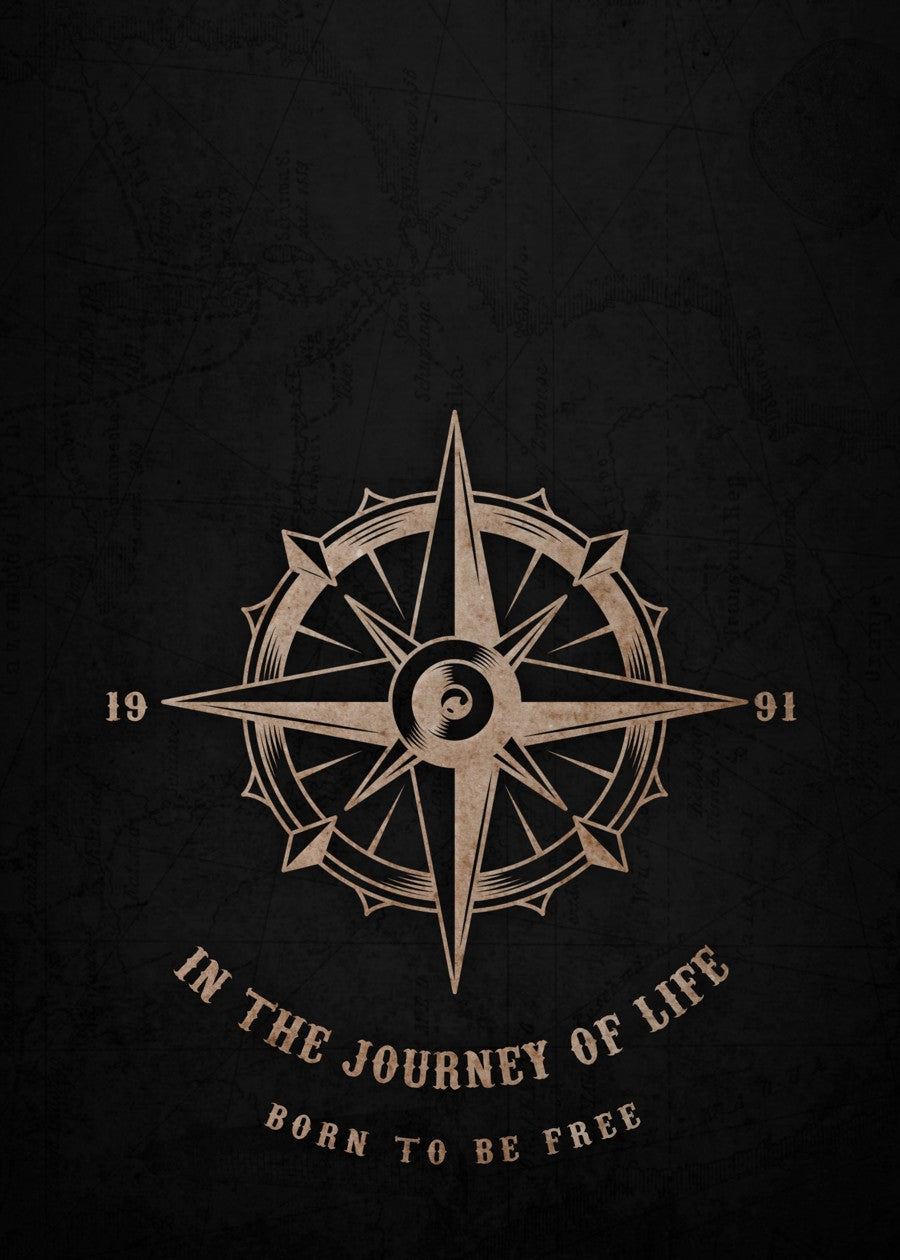 A vintage-style compass with "In the Journey of Life Born to Be Free" and "19 91." Guiding spirit.