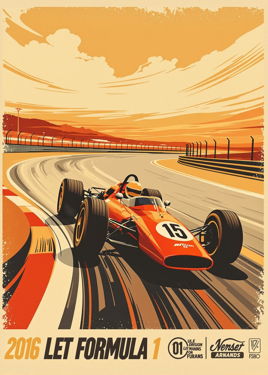 A classic Formula 1 race car on a track, with warm sunset colors, evoking a nostalgic feel for motorsport.