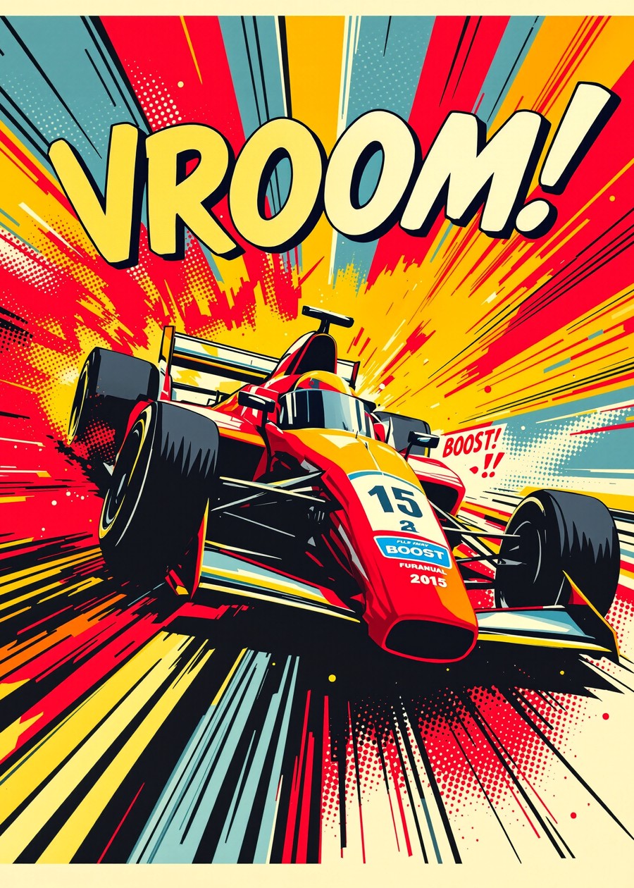 A vibrant, comic-book style illustration of a Formula 1 race car speeding past, with "VROOM!" text and dynamic pop art in the background.