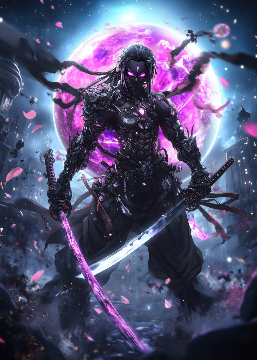 A mystical warrior stands strong beneath a vibrant, magical moon.