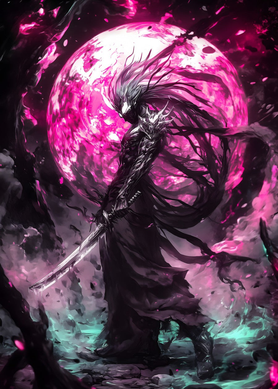 A shadowy warrior stands under a vibrant pink moon, exuding a mysterious aura.