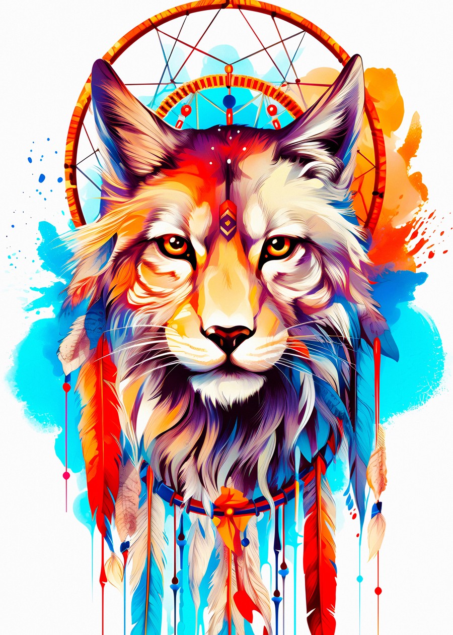 Front-facing, colorful bobcat portrait with a tribal feel. Adorned with a dreamcatcher and bright flowing feathers. Strong, shamanic gaze.