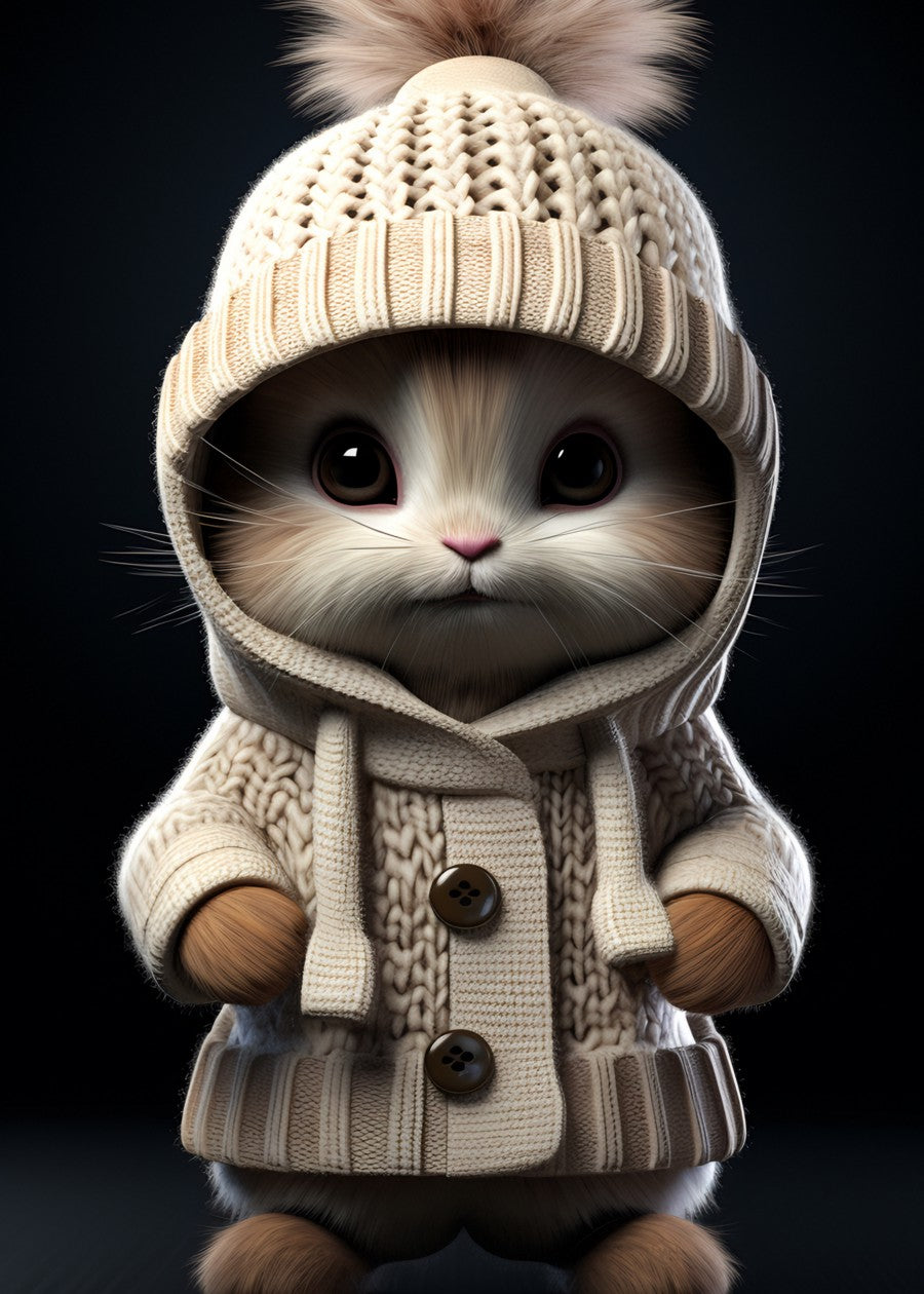 Simply adorable! A tiny, furry friend bundled up in a cozy knit sweater and pom-pom hat.