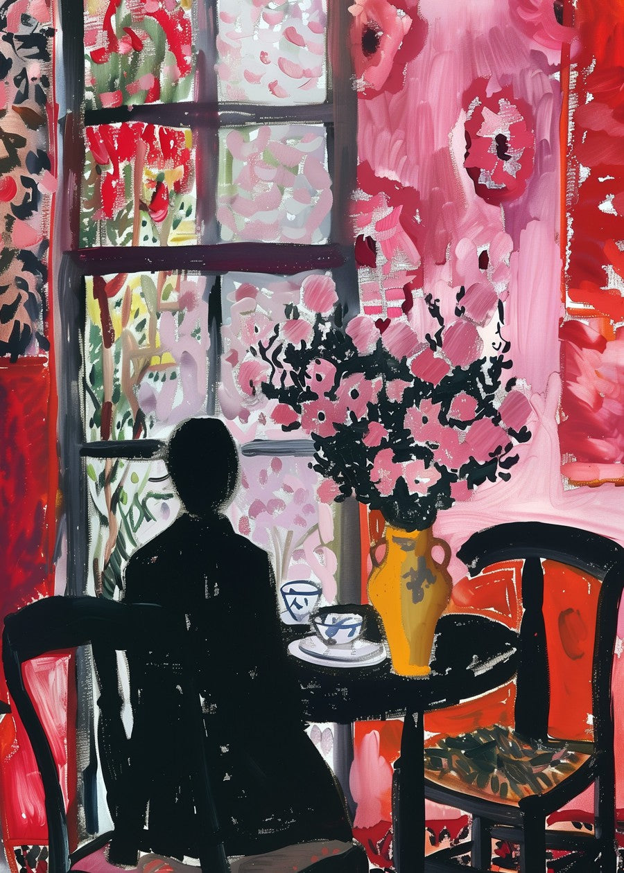 A floral expressionist view of a woman seated at a table by the window. Rich textures and vibrant hues.