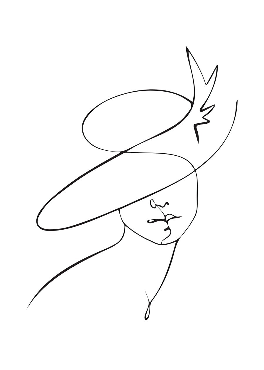 An elegant minimalist illustration created with a single continuous line, depicting a woman wearing a wide-brimmed hat.