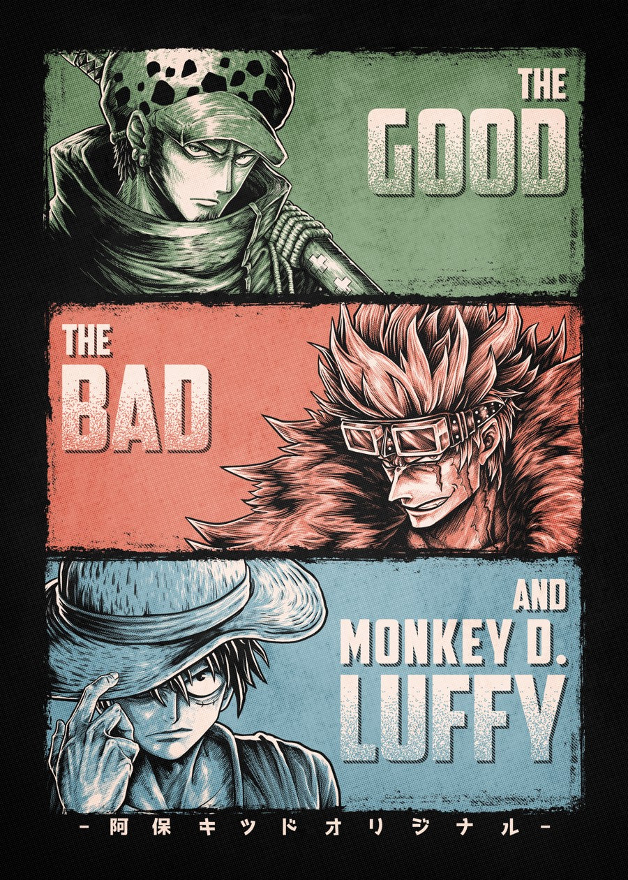 One Piece X The Good, The Bad and The Ugly. Featured illustration of 3 members of the Worst Generation.