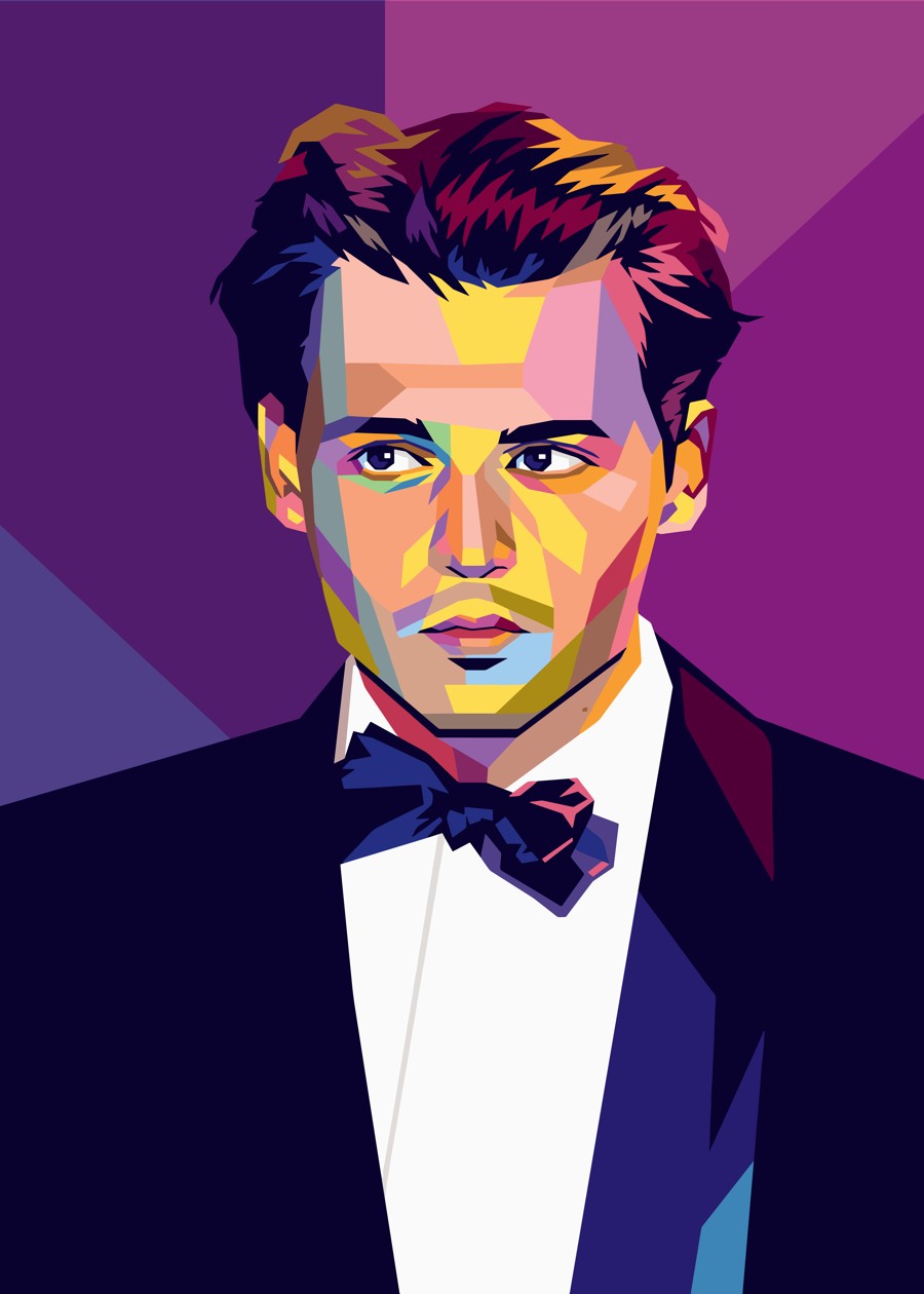 Actor Johnny Depp in a pop art style. The portrait features a vibrant and colorful, geometric represent.