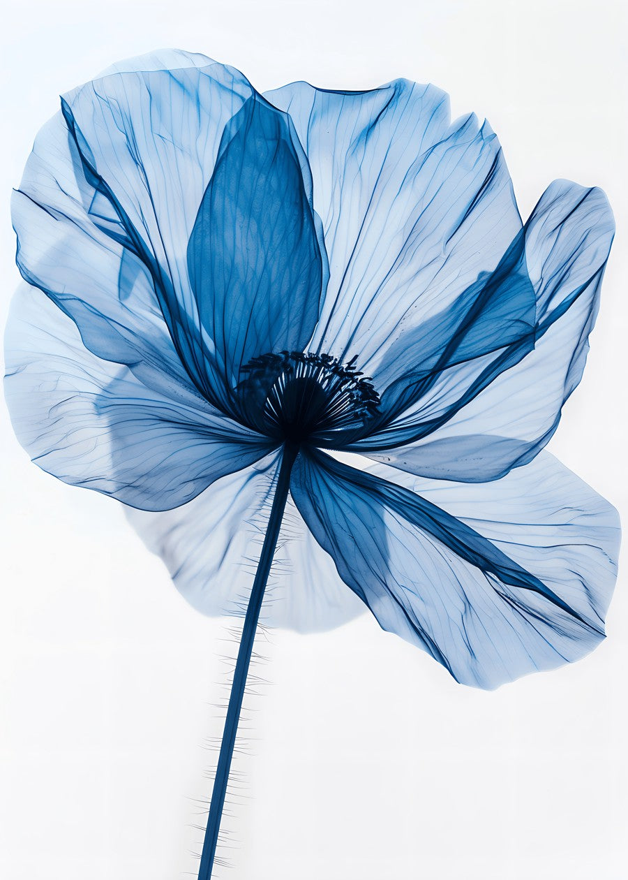 Delicate blue petals unfold in x-ray style, revealing the elegant veins and structure of a flower against a pure white background.