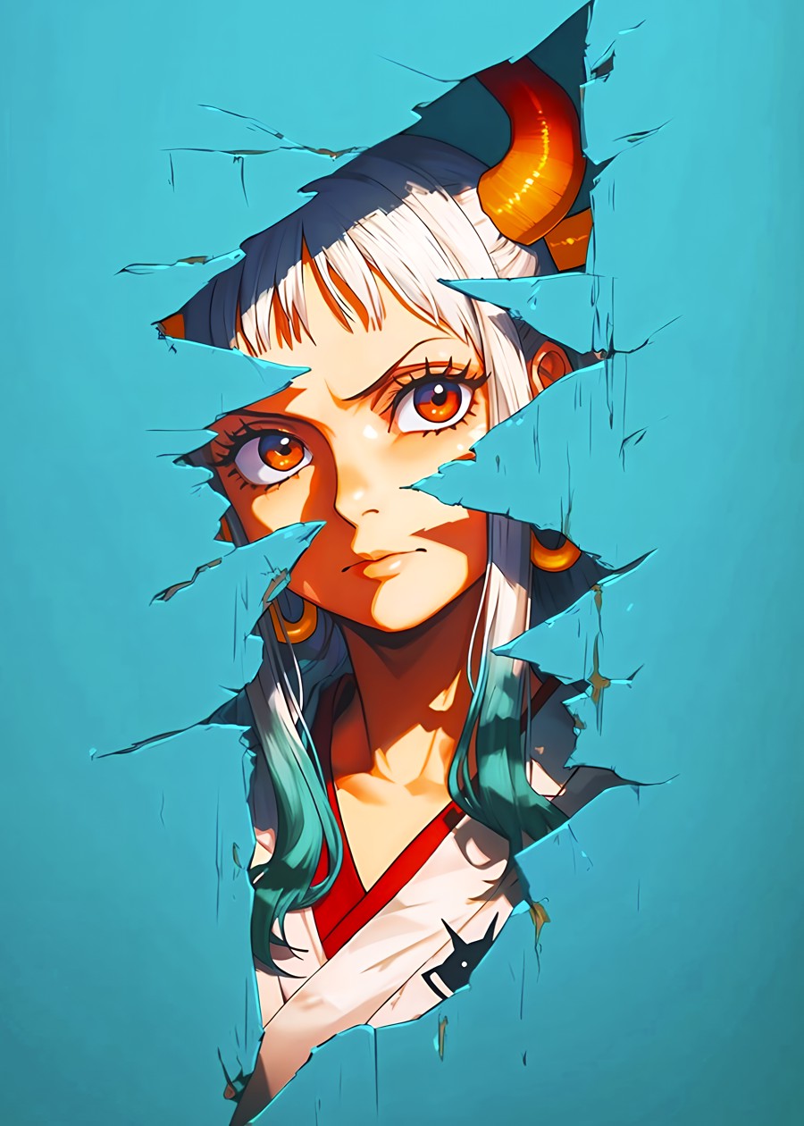 Yamato bursts through a bright blue tear, fiery eyes and flowing hair shining as their powerful gaze breaks through the barrier.