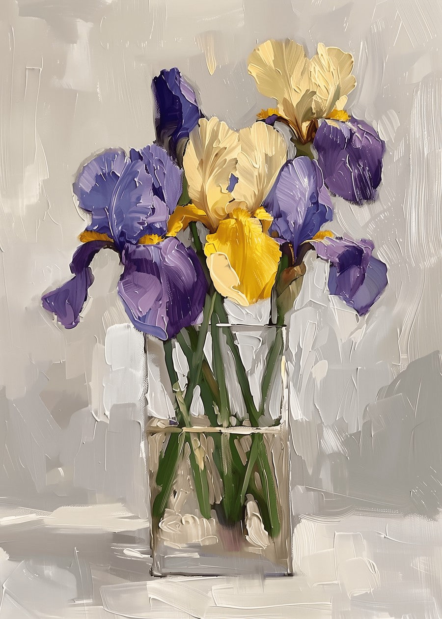 A painterly still life of yellow and purple iris flowers in a glass vase, bursting with textured brushstrokes and timeless charm.