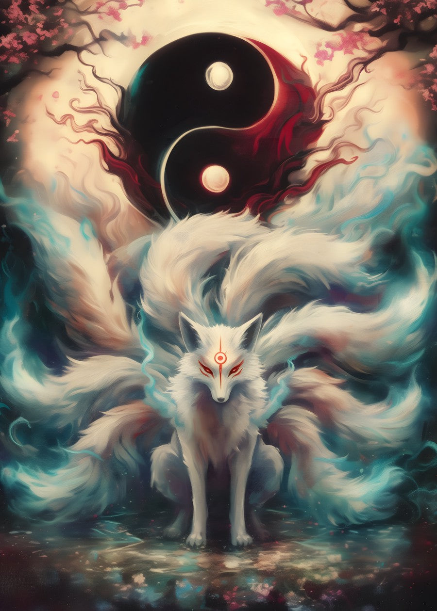 A cute Kitsune Fox with white fur and lightning blue tails with magical Yin and Yang in the background.