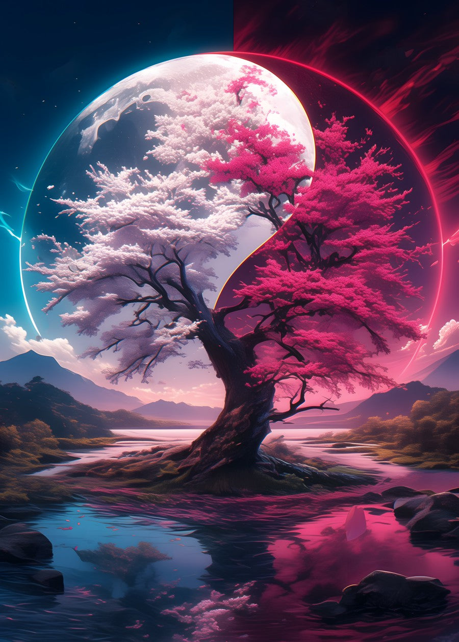 A mystical tree splits a vibrant landscape reflecting balance and harmony.