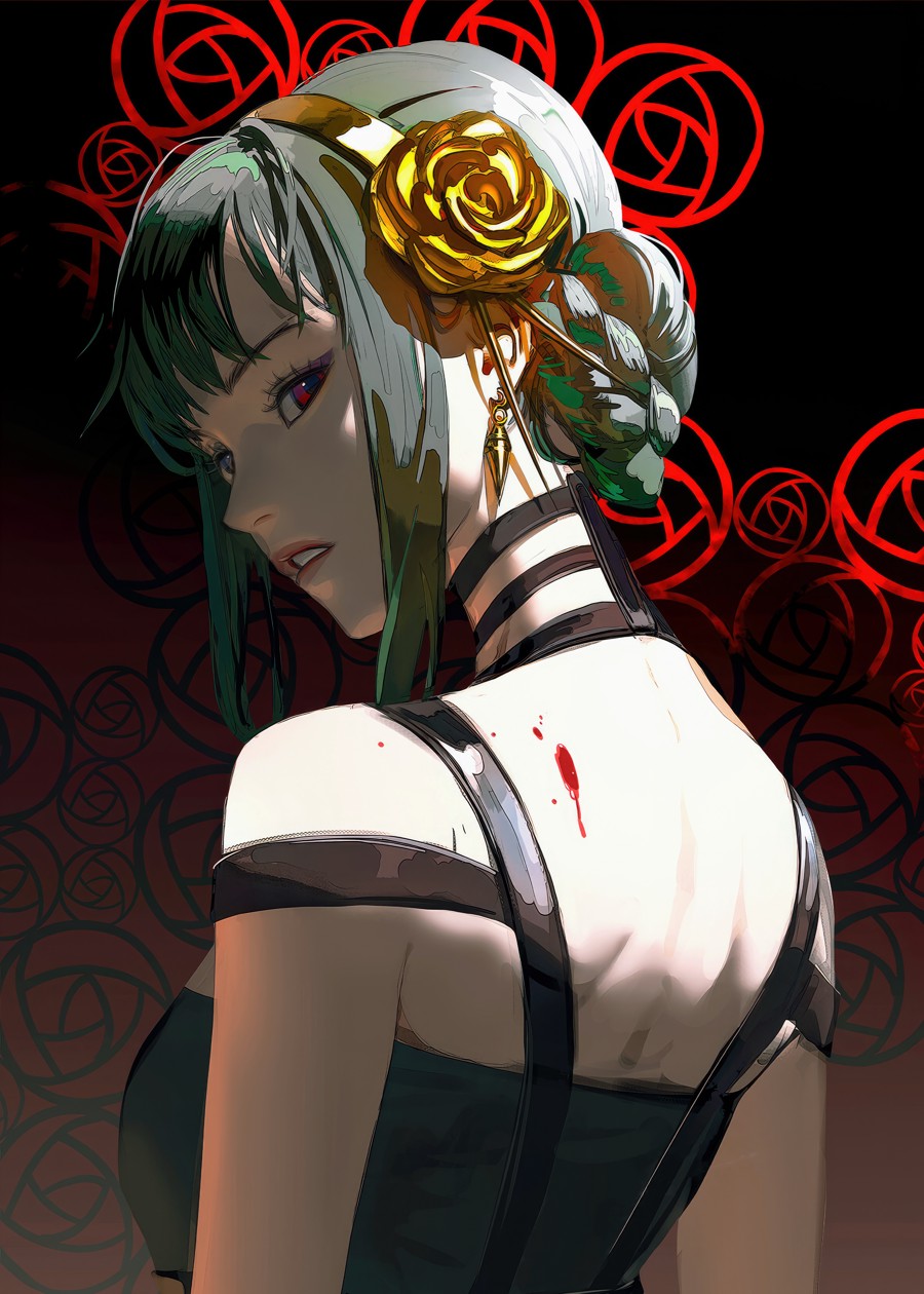 A graceful woman with dark hair and striking eyes, dressed in a sleek black outfit.