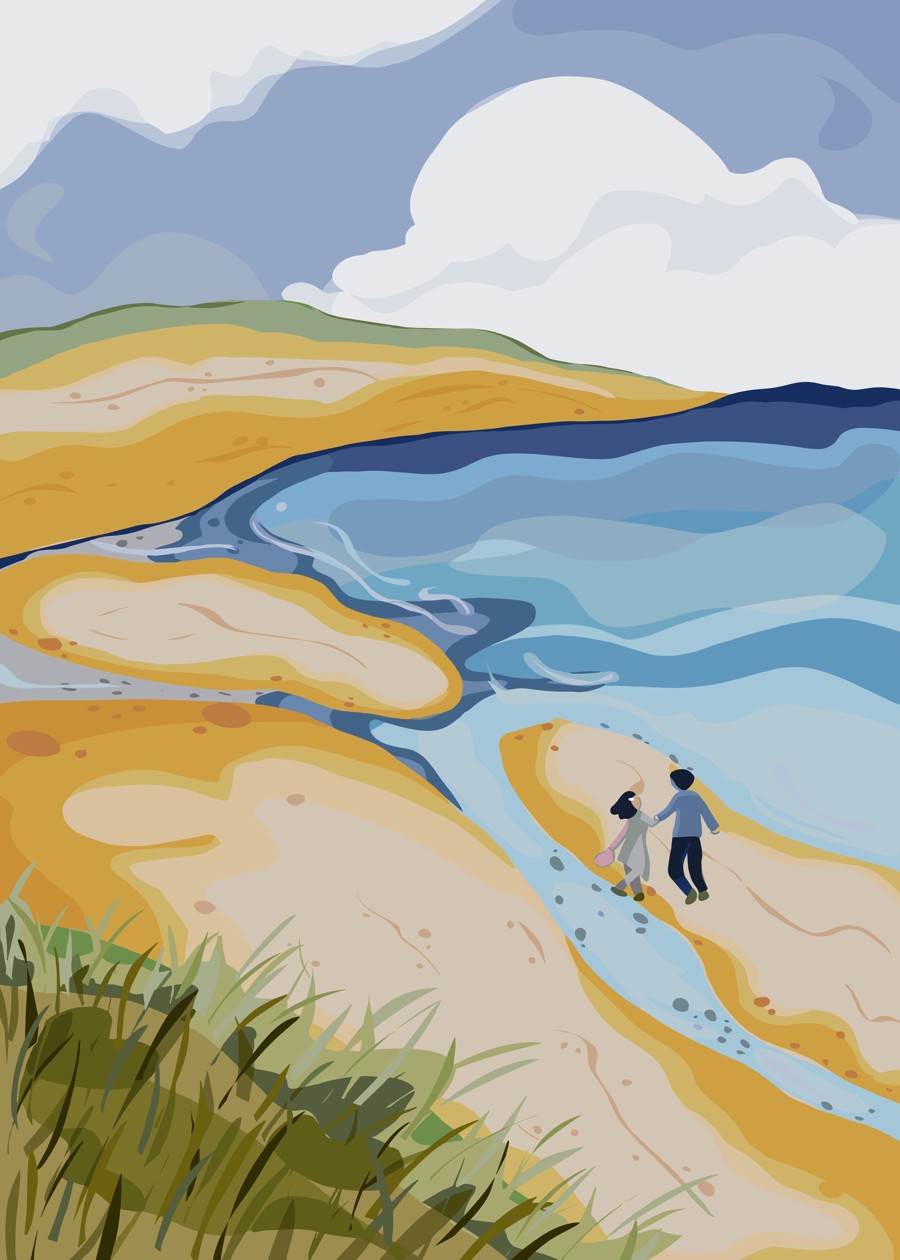 A peaceful illustration of a couple walking hand in hand along a scenic coastline, surrounded by golden sands, gentle waves, and grassy dune.
