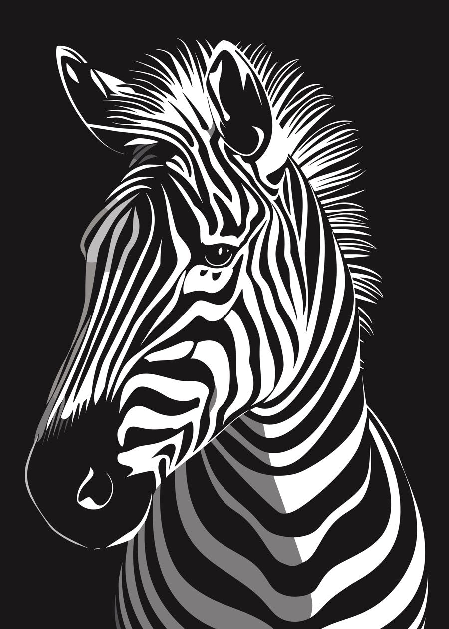 A black-and-white zebra shown in half-profile, emphasizing its striped pattern and spiky mane.