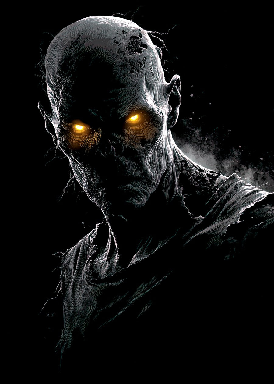 Eerie Figure With Glowing Eyes Emerges From Darkness in a Haunting Scene of Mystery and Terror