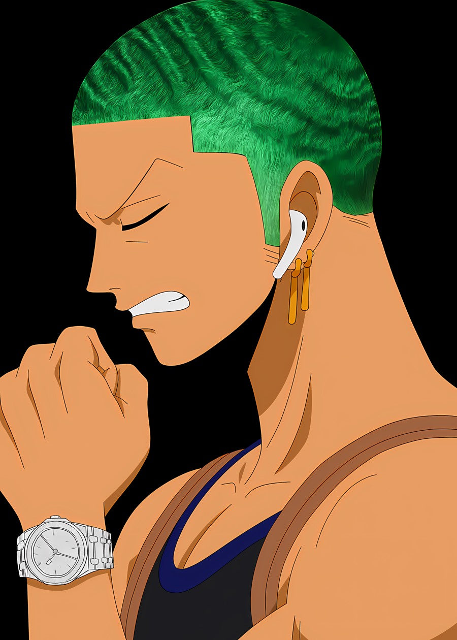 Zoro with green 360 waves, earrings, and luxury watch. Stylish anime design with bold modern twist.